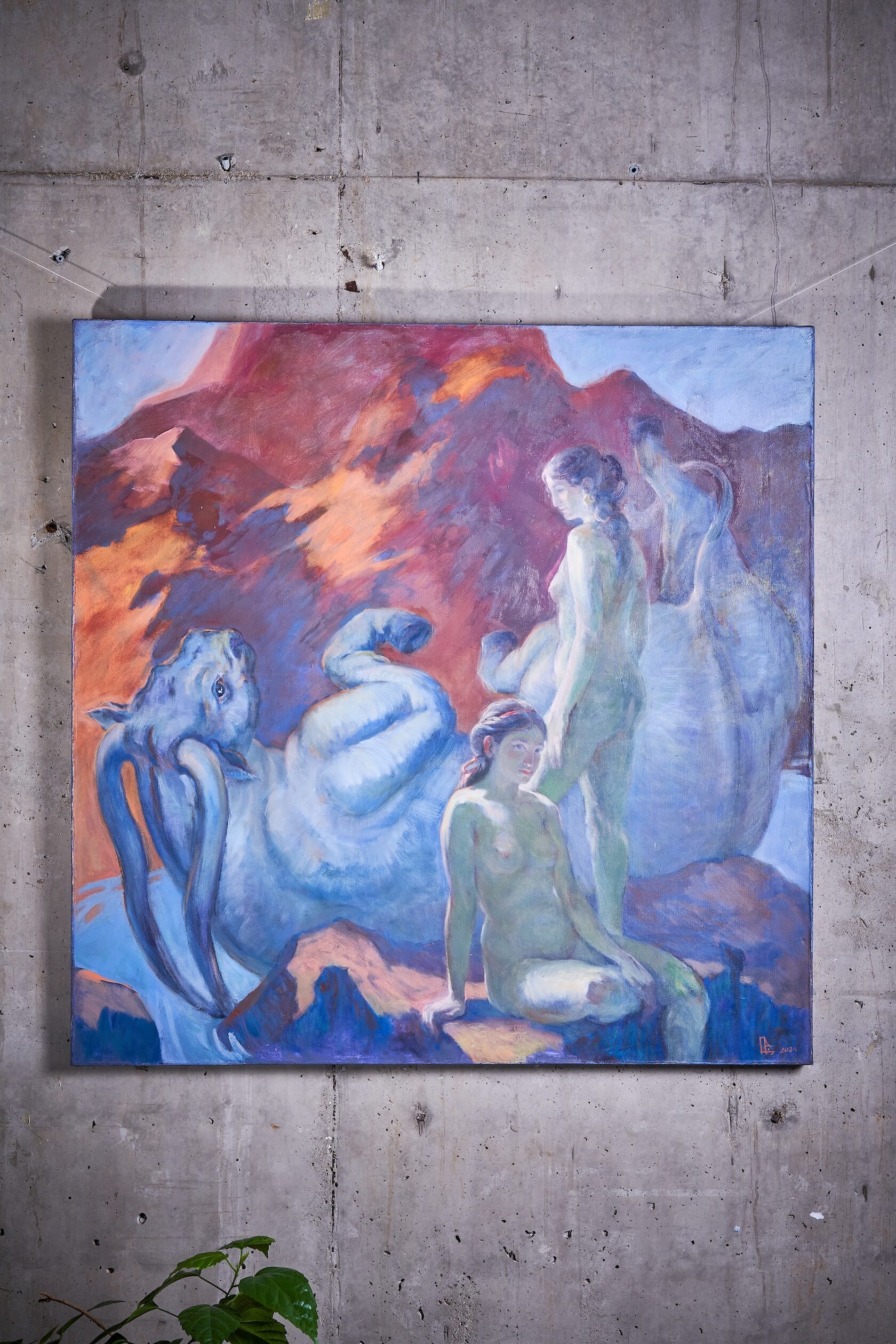 The work depicts a psychological and sentimental moment inspired by the legends of the adventures of Zeus. Through the gaze of the figure in the foreground, who looks directly at the viewer, we immerse ourselves in a mystical atmosphere, marked by the frightening mystery of the metamorphosis of Taurus and the foreboding of an inevitable misfortune. This cannot be stopped, because passion and curiosity have already seized Europe, who is ready to follow the gentle Taurus, without suspecting anything.
