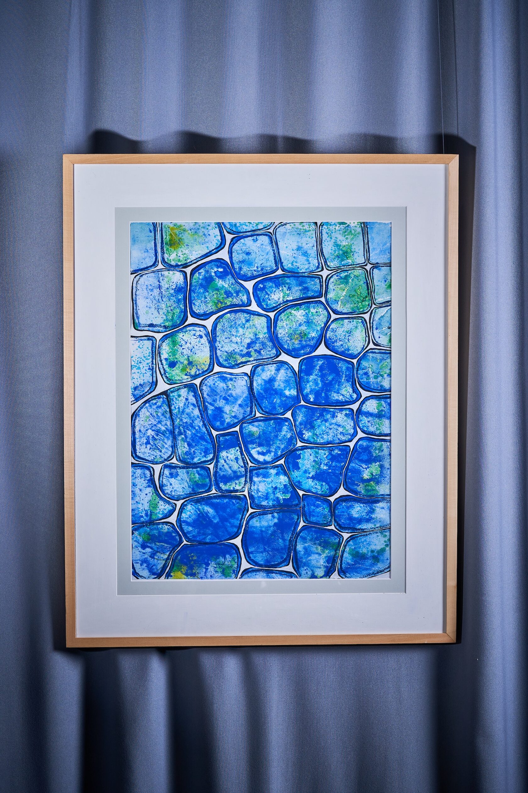 The work explores the stillness and stability of stones, captured through organic shapes and fluid visual rhythms. The tones of blue evoke balance, depth and relaxation, inviting the viewer into a contemplative and calm state.
