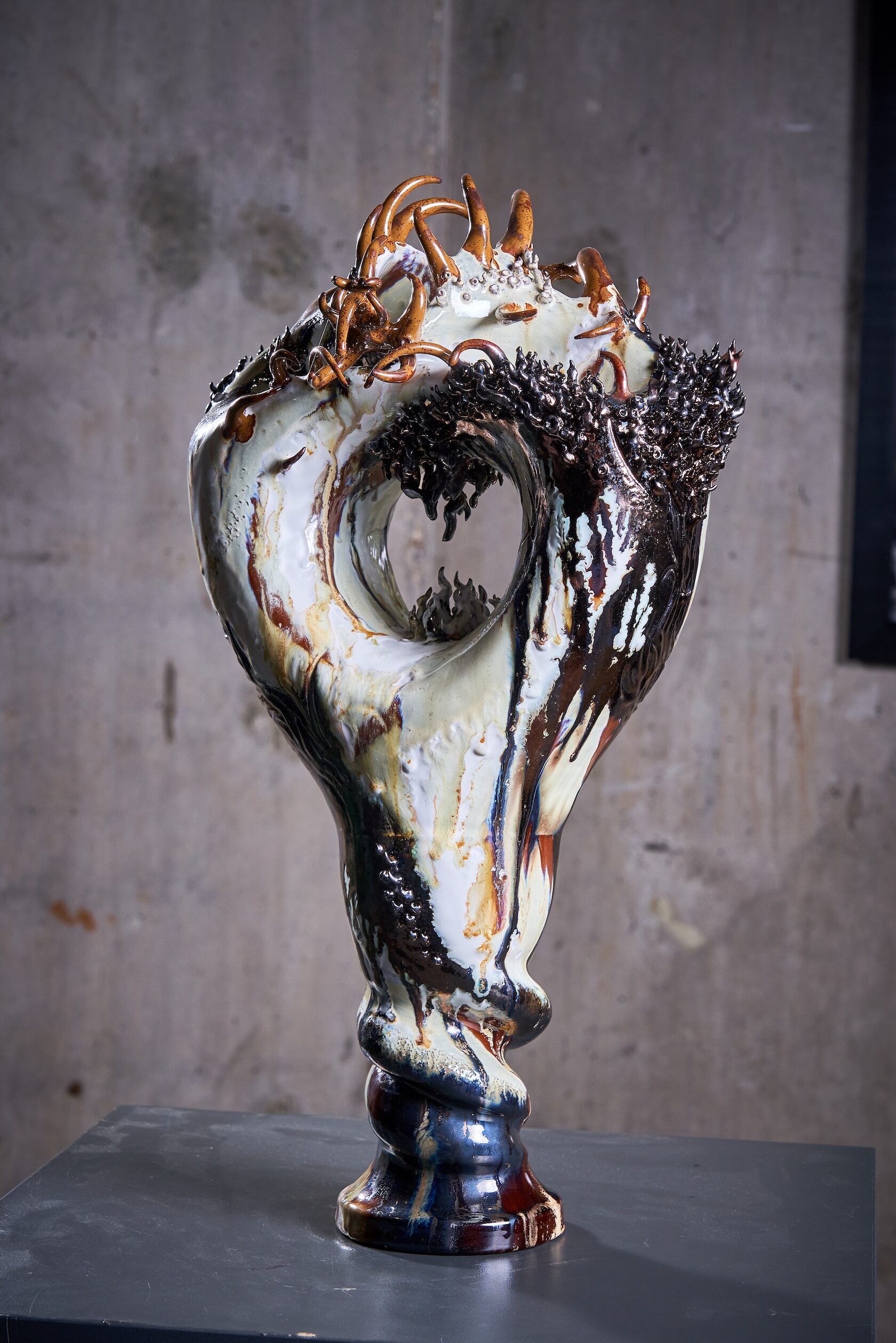 A massive ceramic form, pierced by a central void like a breath, with iridescent surfaces and flowing glazes, crowned with details reminiscent of horns and the ancestral power of nature.